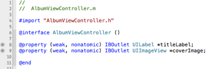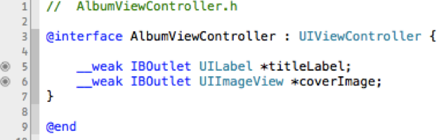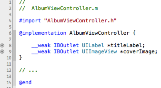 Suppose we have the class AlbumViewController that extends UIViewController, and is used to display information about a music album. In the view, we want to display a title, and some artwork. So we make our storyboard, and drop a UILabel and UIImageView into a view controller of the class AlbumViewController. Now, how do we hook them up? We’ve got really four alternatives: