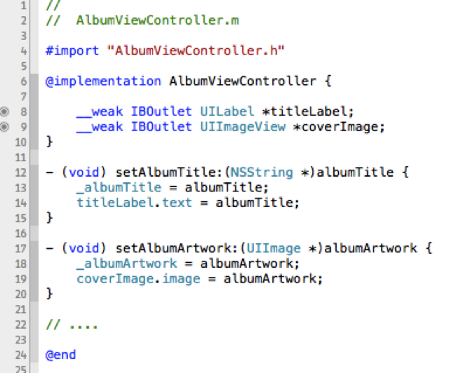 So, in the example above, if we choose properties, hidden or explicitly public, we invite other objects to manipulate these properties directly. Thus we need to inspect our interface: does it make sense to expose the UILabel and UIImageView directly? Can the class AlbumViewController handle that other objects will manipulate these views? Probably not.