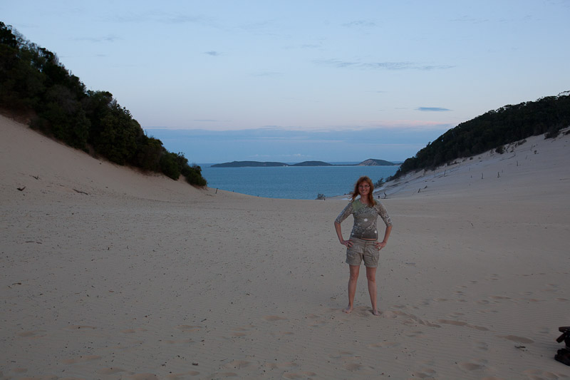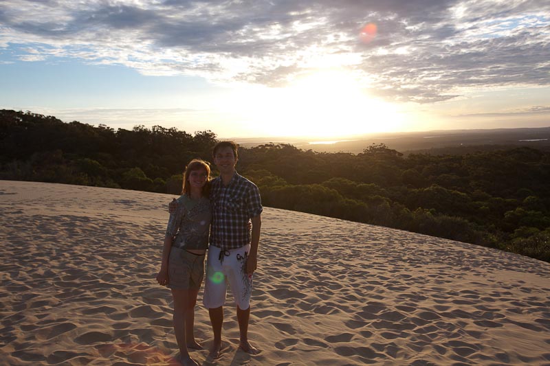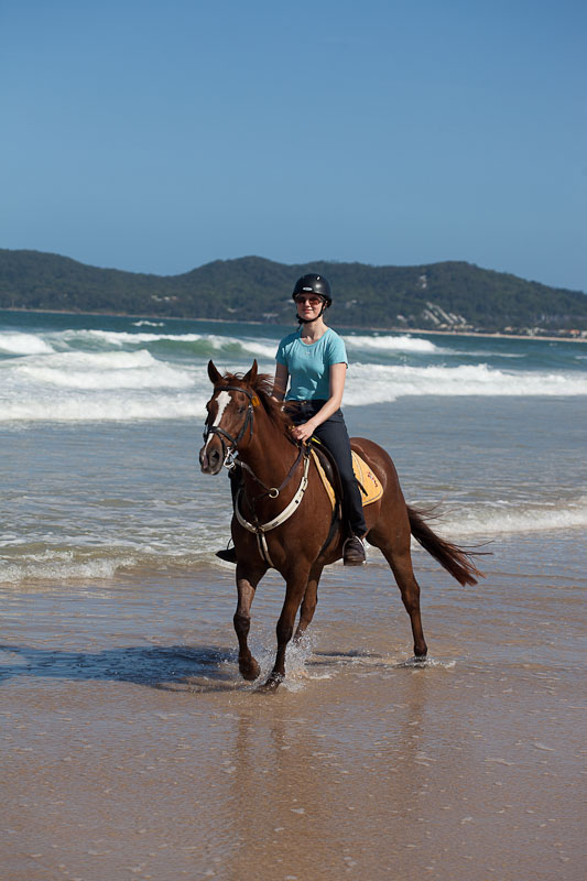 Fra Noosa kørte vi videre nordpå til Rainbow Beach, der har fået sit navn efter de forskellige farver sand på standens klitter. Her legede vi atter med bølgerne og desuden oplevede vi en smuk solnedgang på Carlo Sandblow. På vejen fra Noosa til Rainbow Beach kørte vi dog først forbi Great Sandy National Park, hvor jeg benyttede chancen til en ridetur i bushen og langs stranden. Ikke en billig fornøjelse, da jeg som øvet rytter skulle have en tur kun sammen med en instruktør, men det var pengene værd at galoppere af sted langs vandkanten på en kæmpelang hvid sandstrand. Desværre har jeg kun billeder af hesten, som hed Amber og jeg i skridt, da Amber var en af Equetons hurtigste heste, så instruktørens hest kunne på ingen måde følge med, og Niklas kom først ned på stranden, da vi var på vej tilbage.