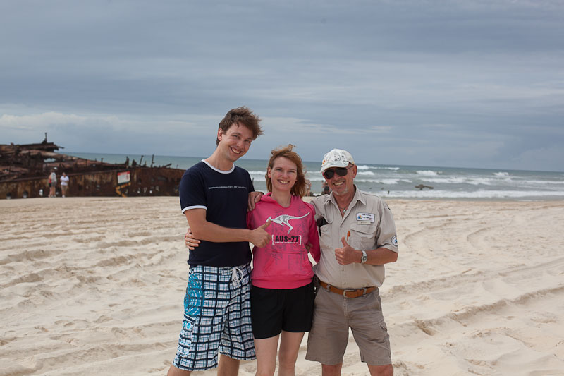 Afslutningen på Niklas og min 2 dages tur på Fraser Island, blev nemlig ganske dramatisk og mindeværdig. Fraser Island er som sagt verdens største sandø, og køreforholdende er mildt sagt vanskelige med løst sand, tidevand og klipper. Adskillige busser og jeeps er derfor i årenes løb kørt fast i sandet, og når de først er det, bliver det sjældent med et heldigt udfald. Tidevandet tager hurtigt køretøjerne og efter en omgang saltvand samt tonsvis af sand, er det de færreste køretøjer, der klarer at starte igen. Stor var hele gruppens spænding derfor, da vores bus kørte totalt fast i det våde sand tæt ved strandkanten med indkommende tidevand. Med kun én skovl til at grave bussen fri var opfindsomheden stor, og der blev brugt hænder, sandaler og pinde til at grave med. Efter et par forsøg lykkedes det på et hængende hår med tidevandet og bølgerne i hælene at få bussen kørt væk til stor jubel.